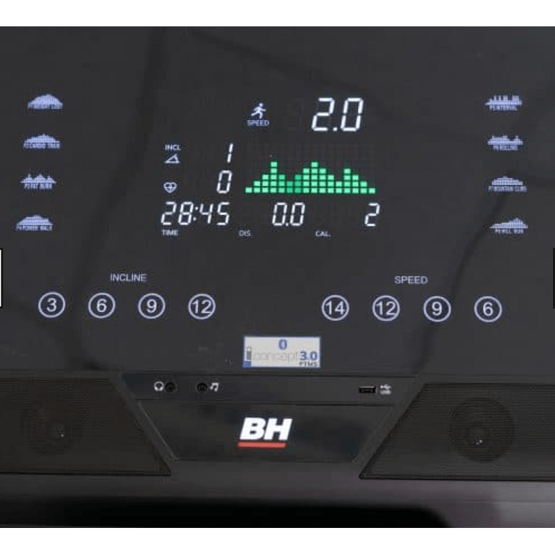 Ovládací konzole trenažeru BH Fitness RS900 je vybavena přehledným LED DOT Matrix displejem. Ovládání je velice jednoduché, kromě manuální regulace rychlosti a sklonu jsou součástí přednastavené zátěžové profily, které podle křivky regulují rychlost.