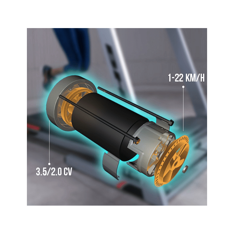 Trenažér s motorem o max. výkonu 4,0 HP umožňuje nastavení rychlostí v rozmezí 1 až 22 km/h. Běžecká plocha o rozměrech 50 x 140 cm je vybavena kvalitním odpružením, které zaručí měkký došlap a zmírní otřesy na minimum. Sklon je elektronicky regulovatelný až do 12 %.