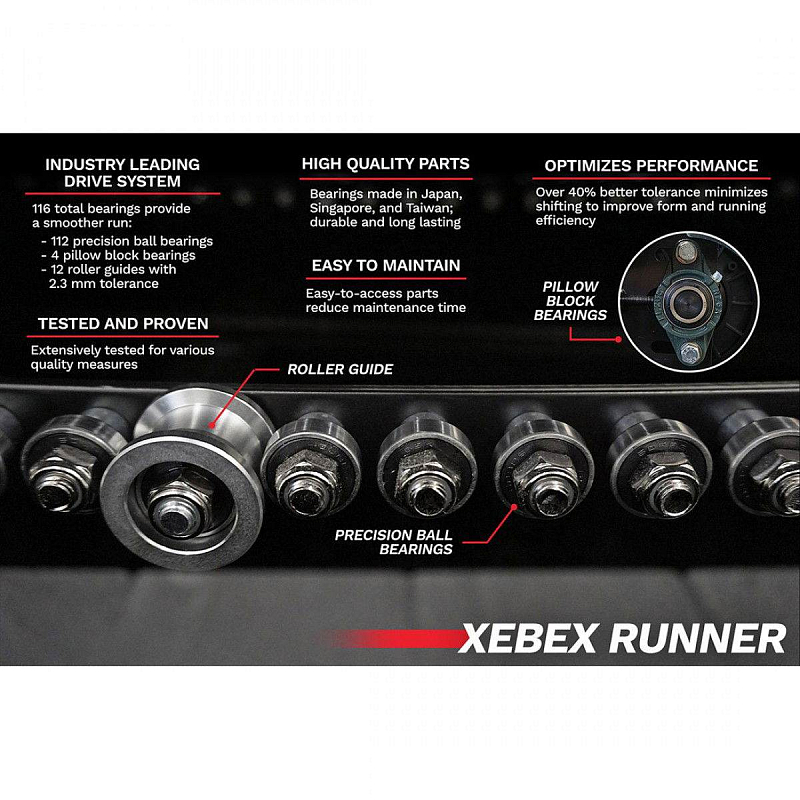 XEBEX Runner disponuje stabilizačními šrouby, které vám pomohou vyrovnat nerovnost podlahy. Též oceníte přepravní kolečka, která vám usnadní přesun pásu na místo, kam budete potřebovat.