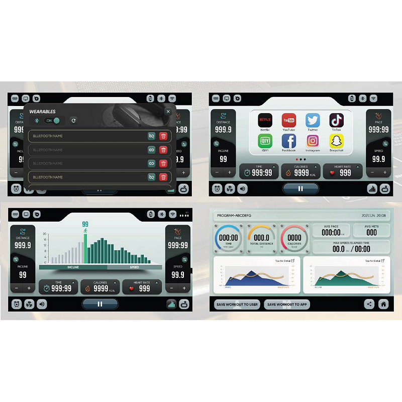 | Měřené hodnoty: | Spálené kalorie, Tep srdce, Vzdálenost, Signalizace překročení tepu, Čas běhu, Rychlost běhu, Sklon pásu |