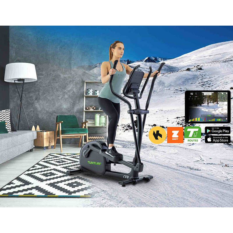 Eliptický trenažér TUNTURI C60 R nabízí díky pohonu zadního setrvačníku až 31 kg rotující hmoty rozmanitost, náročnost a intenzitu tréninku. Díky 26 programům, osobnímu programu generovanému umělou inteligencí a 48 úrovním odporu budete vždy trénovat na své úrovni.