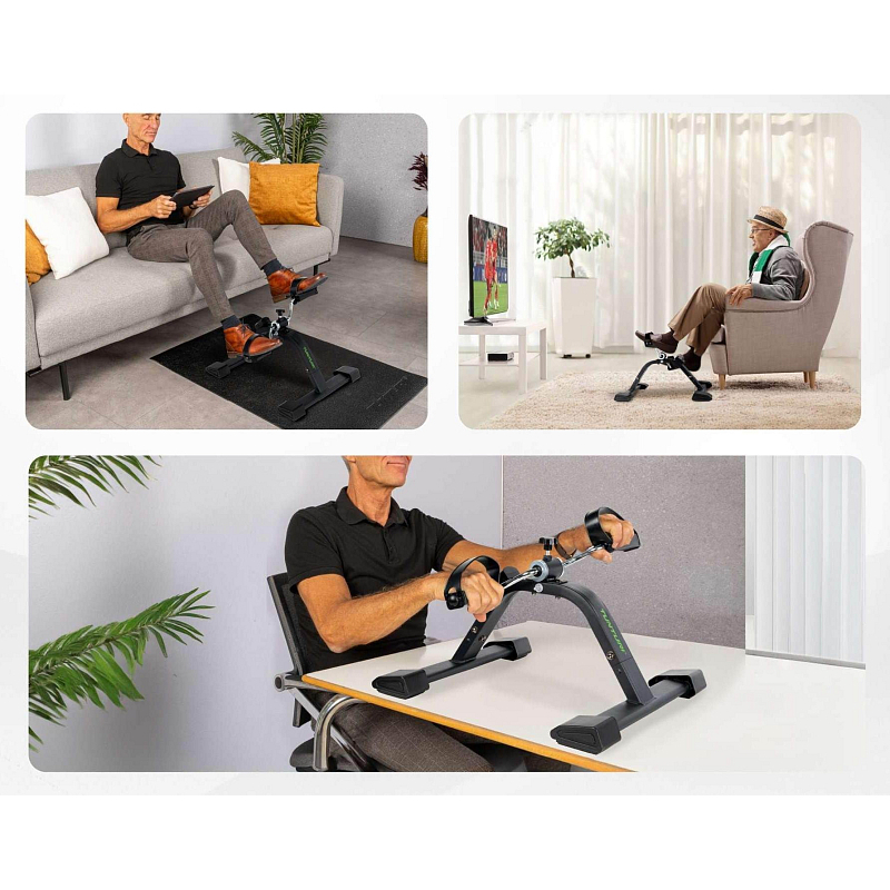 Tunturi Mini Bike Pro umožňuje šlapání nejen dolními, ale i horními končetinami. Stačí minibike postavit na stůl a zapojit ruce podobným pohybem jako při rotopedu. Tento způsob cvičení je ideální pro posílení ramenního pletence, předloktí a zlepšení mobility v oblasti horních končetin.