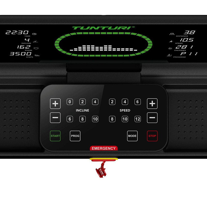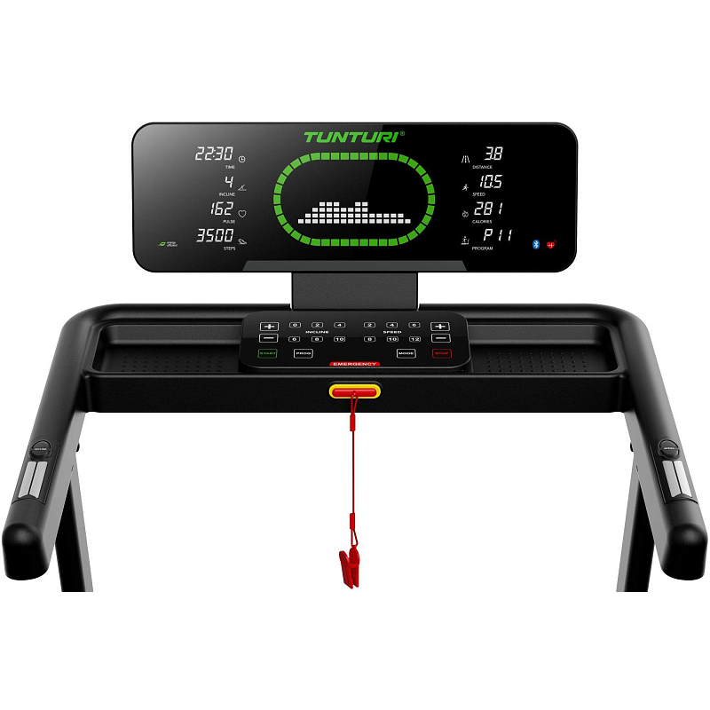 Pro maximální variabilitu tréninku je TUNTURI Cardio Fit T50 vybaven 44 tréninkovými programy, včetně HRC režimů řízených podle tepové frekvence, uživatelských programů, testu tělesného tuku i funkce rychlého startu. Na přehledném LED displeji s vizualizací atletického oválu vidíte všechna důležitá data přehledně uspořádaná po stranách – a i při použití tabletu zůstávají stále na očích. Nechybí držák na tablet, senzory tepu, rychlá tlačítka pro změnu rychlosti a sklonu a Bluetooth konektivita pro připojení k aplikacím i hrudnímu pásu.