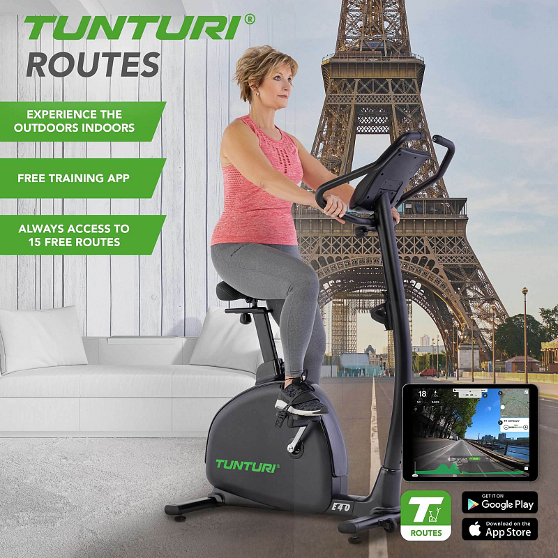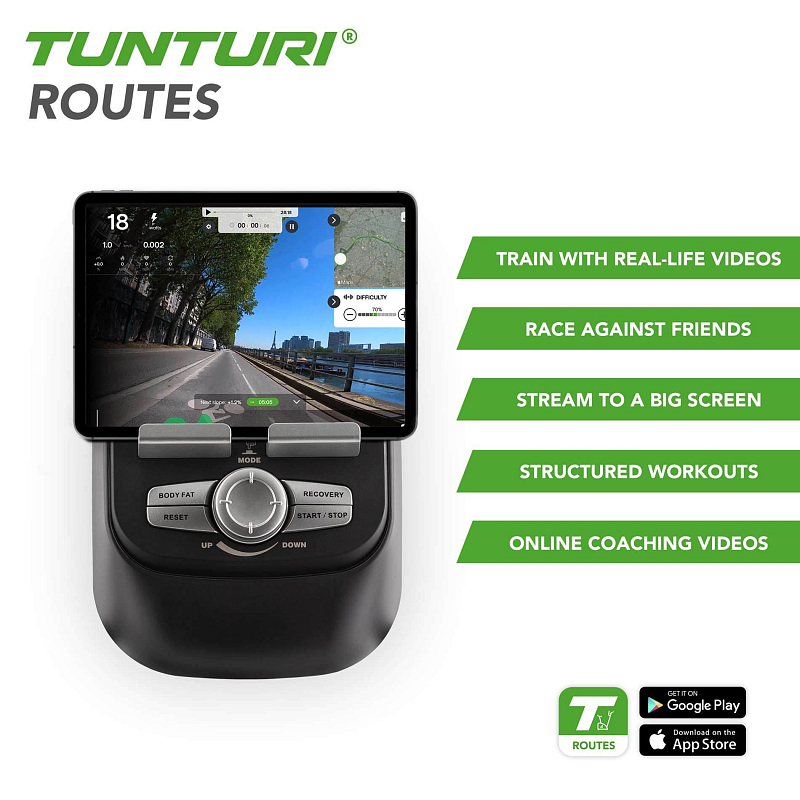Chcete si rozšířit programovou nabídku a udělat si trénink ještě zábavnější? Pak se můžete přes Bluetooth připojit k tréninkovým aplikacím Tunturi Routes, iConsole+ Training, Zwift nebo Kinomap. Díky aplikacím máte k dispozici systém Google Maps, což vám umožní vytvářet vlastní trasy a překonávat nové výzvy.