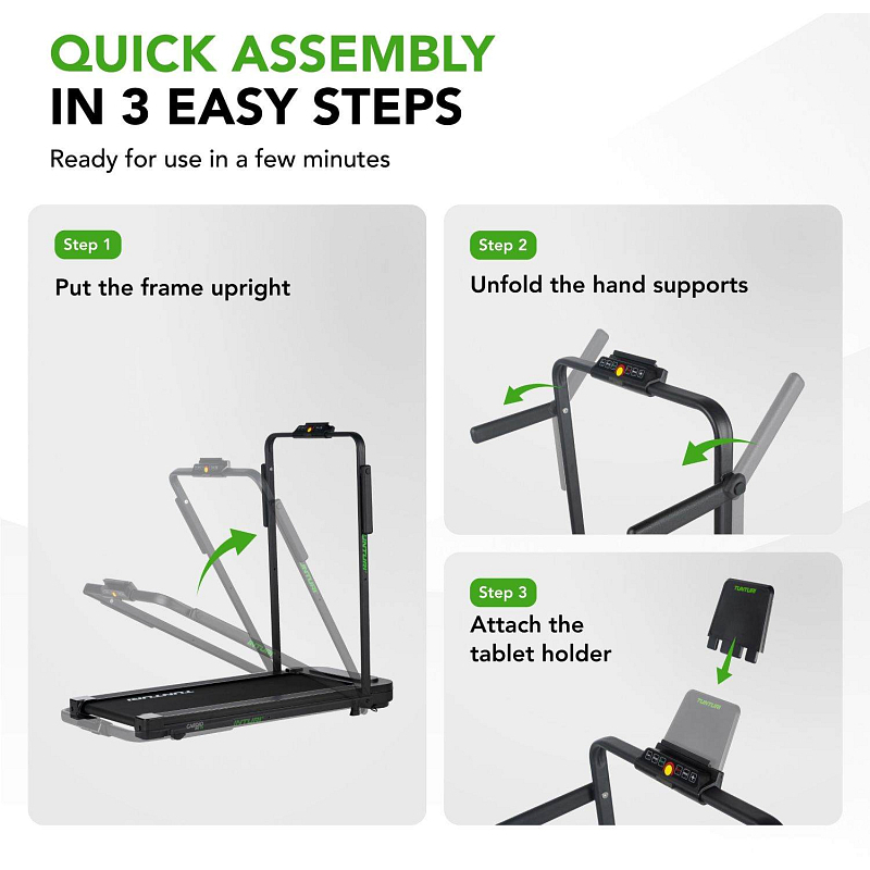 Pás se dodává zcela smontovaný a připravený k použití – rozložíte ho ve třech jednoduchých krocích a můžete hned začít trénovat. Nezabere přitom téměř žádné místo – ve složeném stavu měří pouhých 12,5 cm na výšku a snadno ho zasunete pod postel nebo gauč.