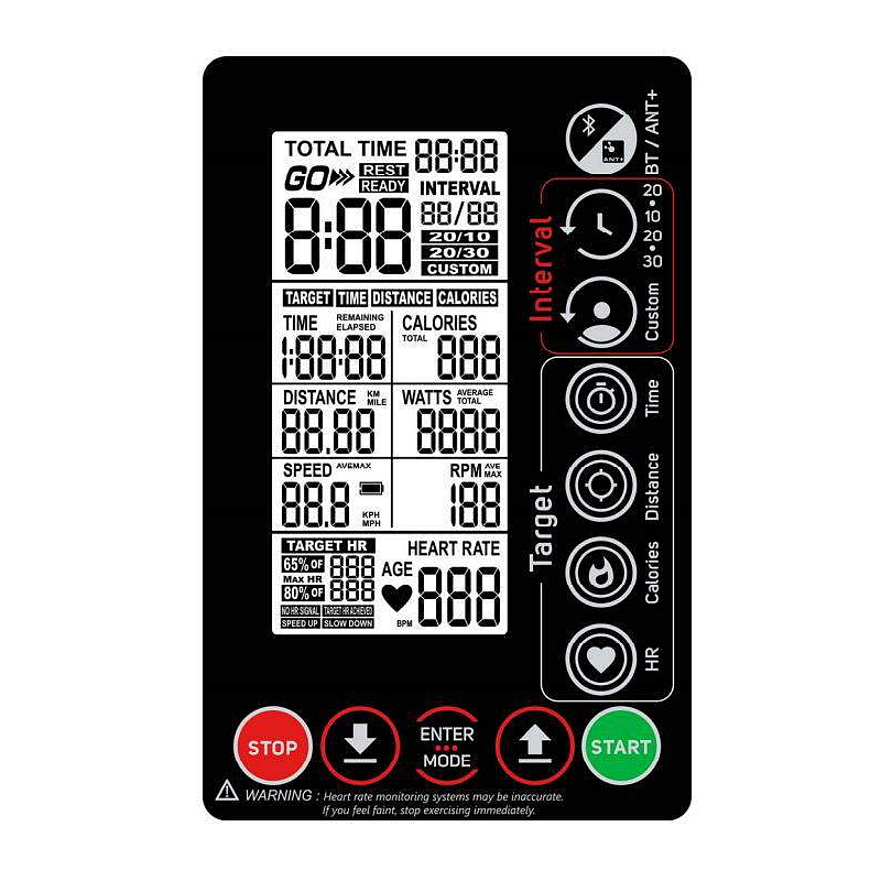 | Měřené hodnoty: | Spálené kalorie, Tep srdce, Čas šlapání, Rychlost, Ujetá vzdálenost, Frekvence otáček, Výkon (W), Signalizace překročení tepu |