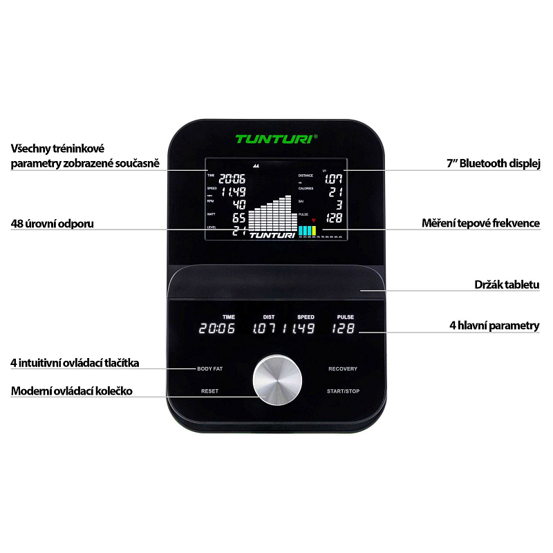 | Měřené hodnoty: | Spálené kalorie, Tep srdce, Čas šlapání, Rychlost, Ujetá vzdálenost, Frekvence otáček, Výkon (W), Zobrazení zátěže na displeji |