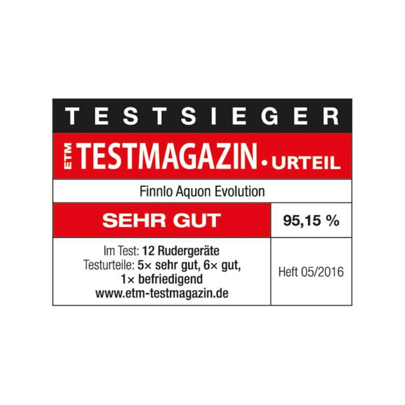 Veslovací trenažér FINNLO Aquon Evolution získal hodnocení "VELMI DOBRÝ" (95,1 %) v testu veslovacích trenažérů německým časopisem Testmagazin.