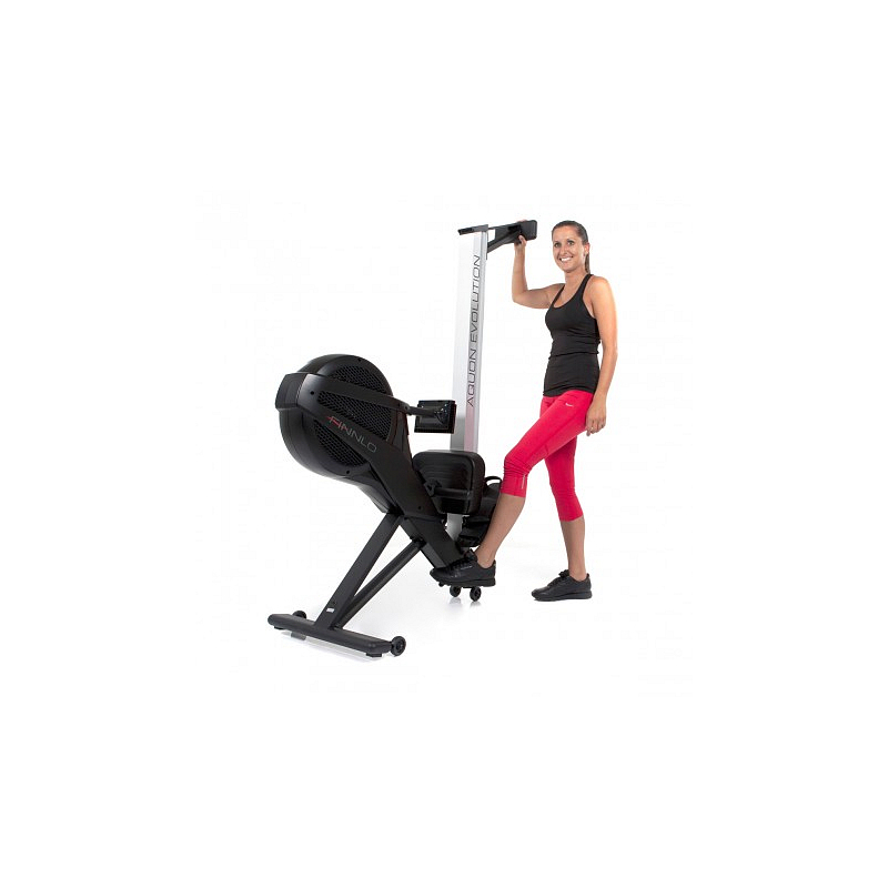 Veslovací trenažer lze sklopit do vertikální polohy pro úsporu místa, pokud zrovna necvičíte. Rozměry po složení jsou 148 x 50 x 196 cm.