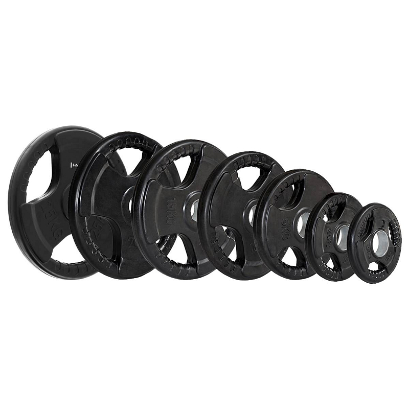 Olympijský, pogumovaný kotouč HMS Tri-grip je známkou kvality a precizního provedení. Tento talíř má otvor o průměru 50 mm, je tedy vhodný pro všechny typy olympijských os. Závaží disponuje třemi držadly pro snadnou manipulaci a pogumovaný povrch prodlužuje jeho životnost.