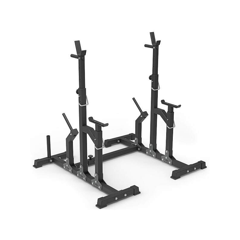 Regulace šířky a výšky stojanů se provádí pomocí šroubu s ergonomickou hlavou. Pro maximální bezpečnost se poloha navíc zajišťuje bezpečnostním kolíkem. Regulace výšky zarážek se provádí pouze bezpečnostním kolíkem. Madla na stojanech slouží k pohodlné změně výšky a zároveň jsou navrhnuty jako podpěry k tréninku dipů. Konstrukce je opatřena dvěma trny pro odložení nepoužívaných závaží, ty zároveň slouží ke zvýšení stability stojanu.