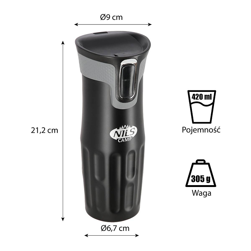 Termohrnek NILS Camp NCC06 se vyznačuje jednoduchou konstrukcí a originálním designem! Termohrnek je vyroben z nerezové oceli s dvojitou stěnou, která zaručuje uchování teplých nápojů po dobu 12 hodin a studených po dobu 24 hodin, nezáleží tedy, zda si do hrnku připravíte ranní kávu, kterou vypijete cestou do práce a nebo zda si do něj přelijete oblíbenou limonádu a vezmete si jej s sebou na několikahodinovou procházku do přírody, termohrnek udrží Váš nápoj ve správné teplotě. Model NCC06 má velmi pohodlný systém otevírání. Pokud se budete chtít napít, jednoduše stačí stisknout tlačítko na přední straně víčka a průtokový otvor se otevře. Jakmile tlačítko pustíte, hrnek se uzavře. Další velkou výhodou je, že spodní část hrnku je opatřena protiskluzovou gumou, která zvyšuje bezpečnost před rozlitím horké kávy nebo čaje, když je hrnek otevřený!
