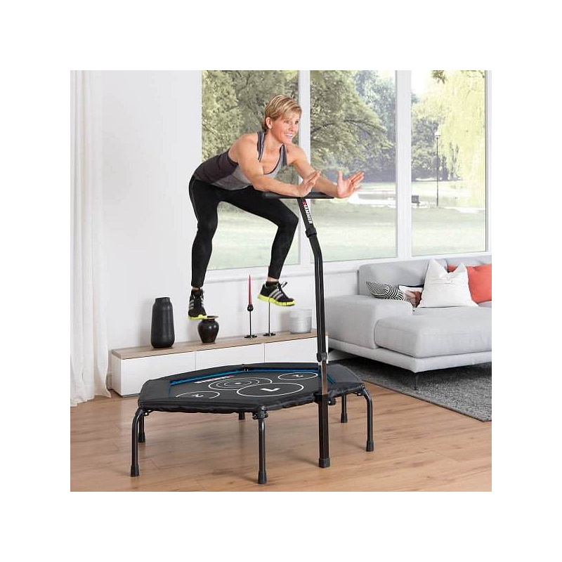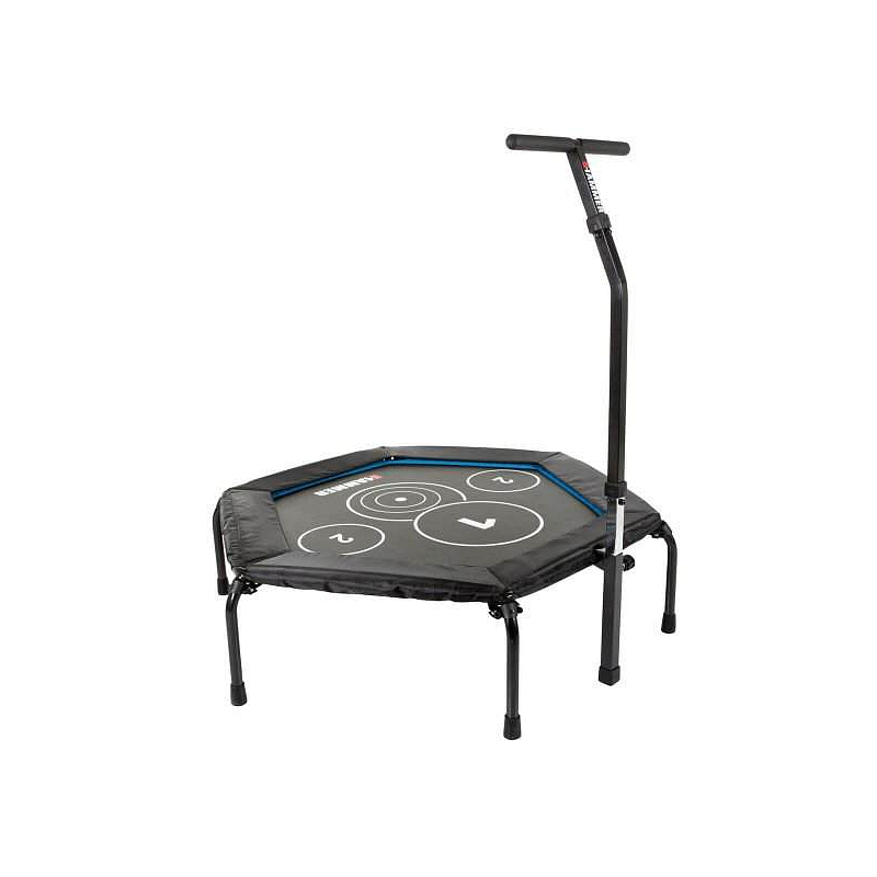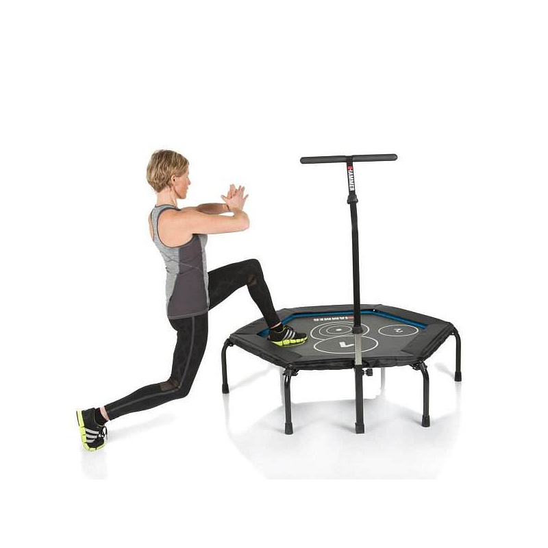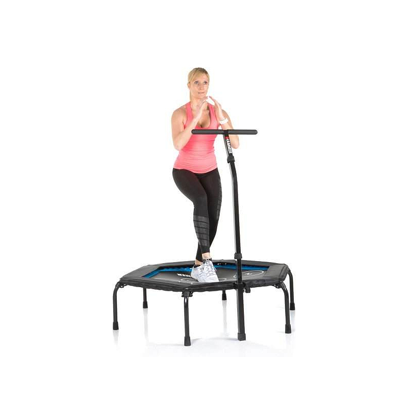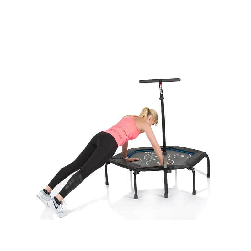 Bezpečnost především. Bezpečnostní kryt, který se snadno odstraní nebo naopak nasadí, zabrání skákání na hranu. Výškově nastavitelná rukojeť v rozmezí 137 - 116 cm má polstrované madlo a představuje bezpečnostní prvek nejen pro začátečníky. Zajišťuje pocit stability i při provádění rychlejších a náročnějších cviků. Protiskluzové gumové nožičky udržují trampolínu ve stabilní poloze, bez ohledu na náročnost tréninku.