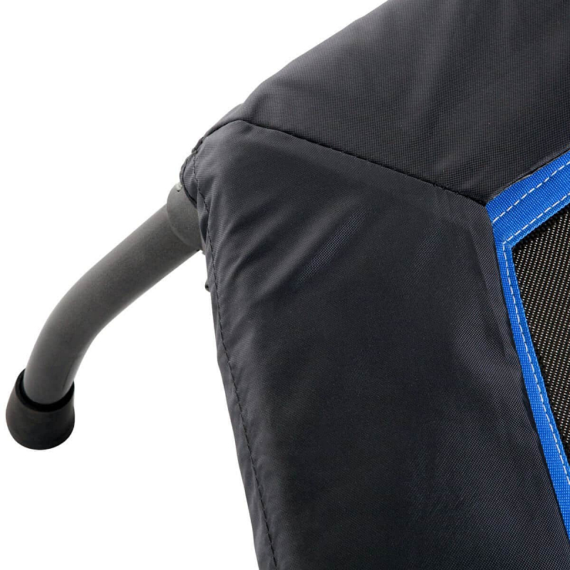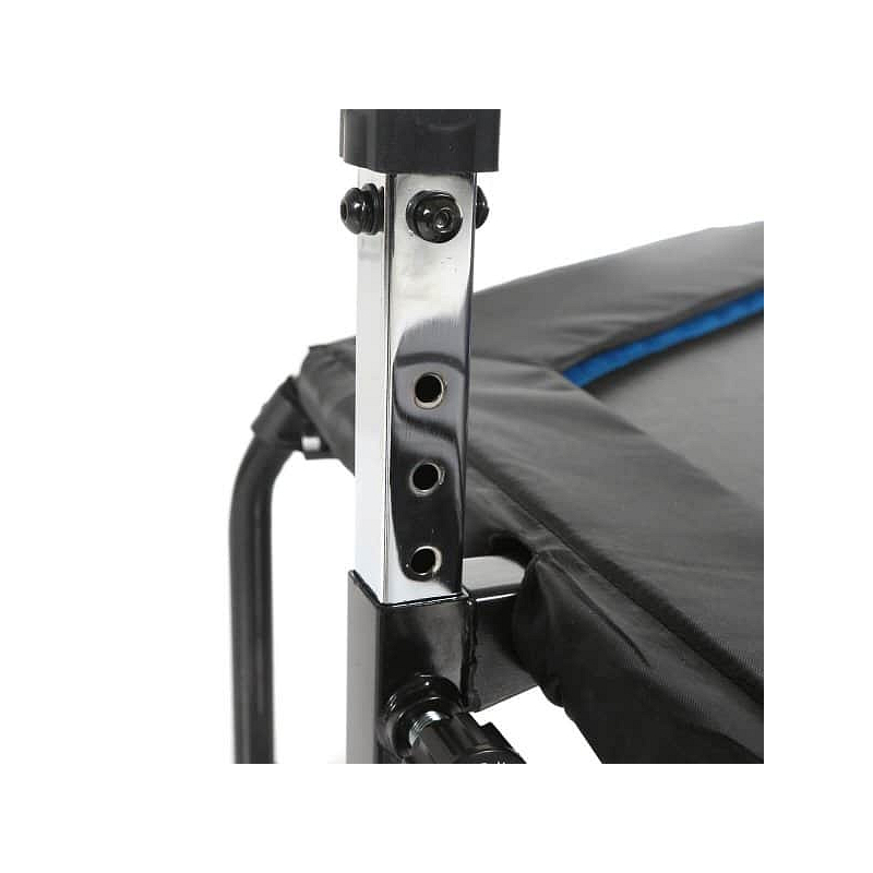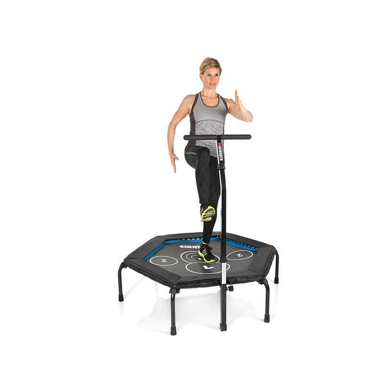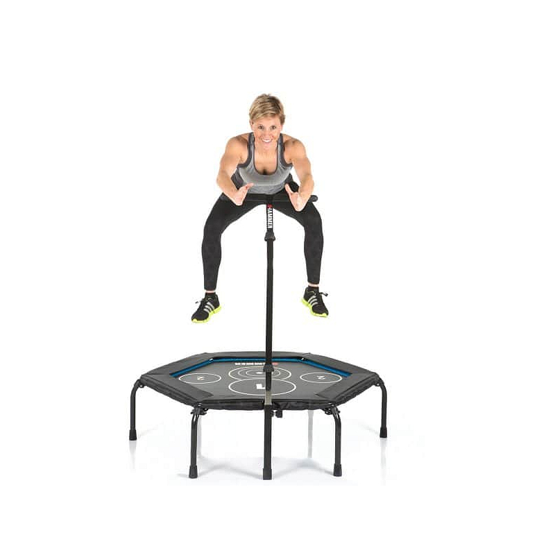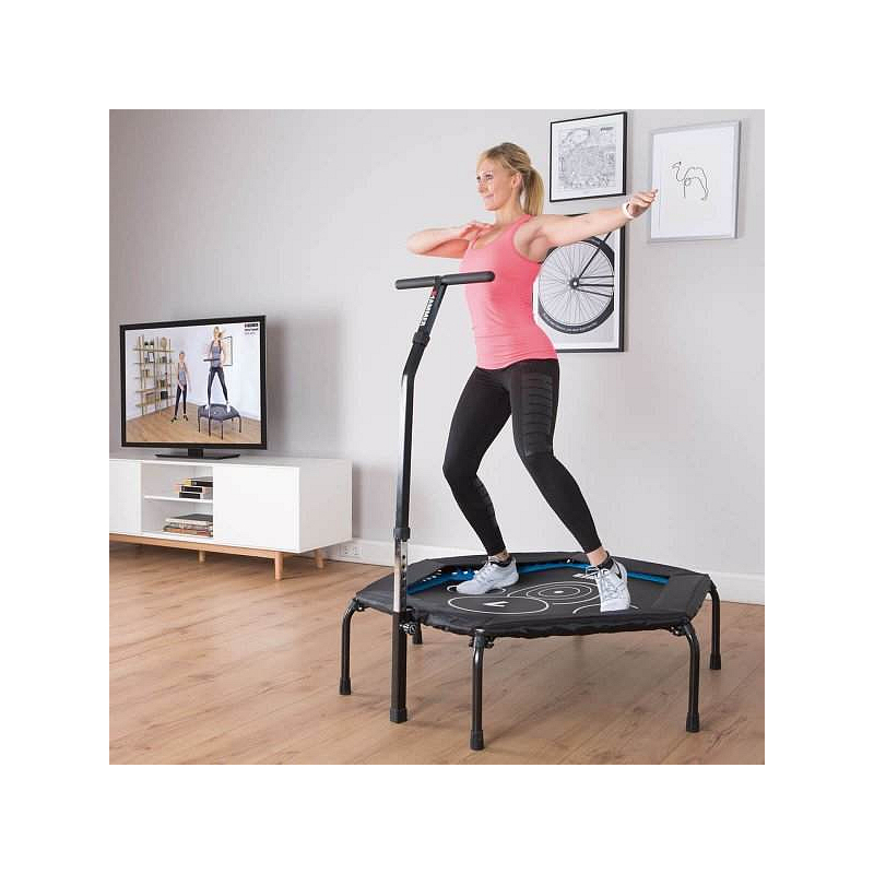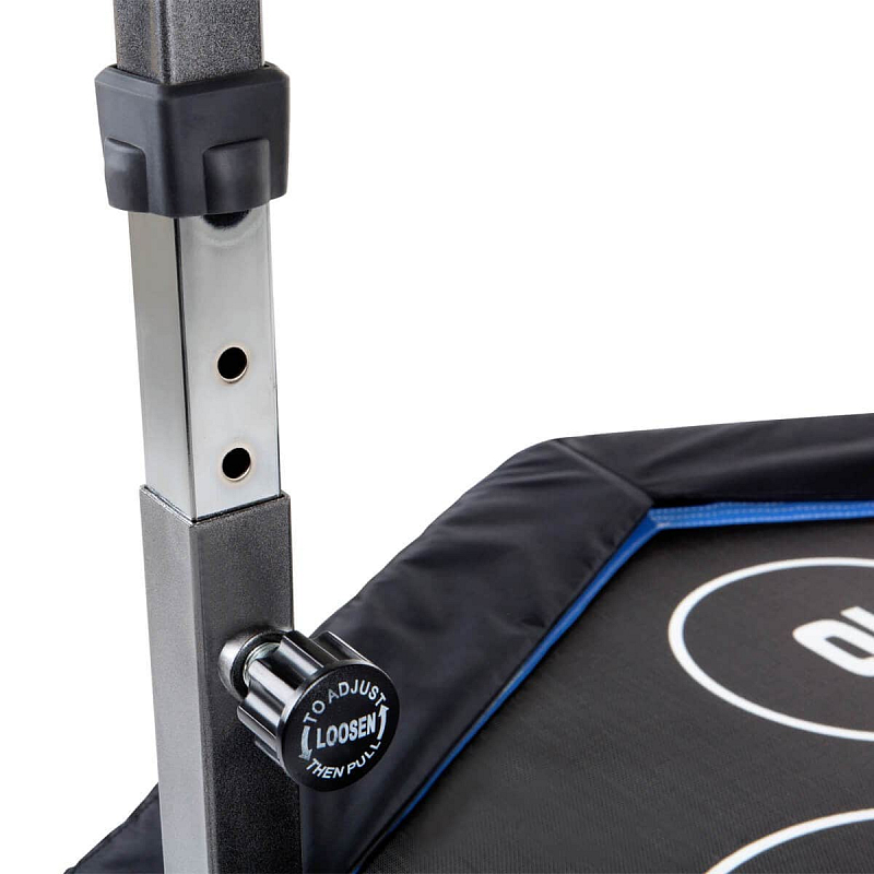 Bezpečnost především. Bezpečnostní kryt, který se snadno odstraní nebo naopak nasadí, zabrání skákání na hranu. Výškově nastavitelná rukojeť v rozmezí 137 - 116 cm má polstrované madlo a představuje bezpečnostní prvek nejen pro začátečníky. Zajišťuje pocit stability i při provádění rychlejších a náročnějších cviků. Protiskluzové gumové nožičky udržují trampolínu ve stabilní poloze, bez ohledu na náročnost tréninku.