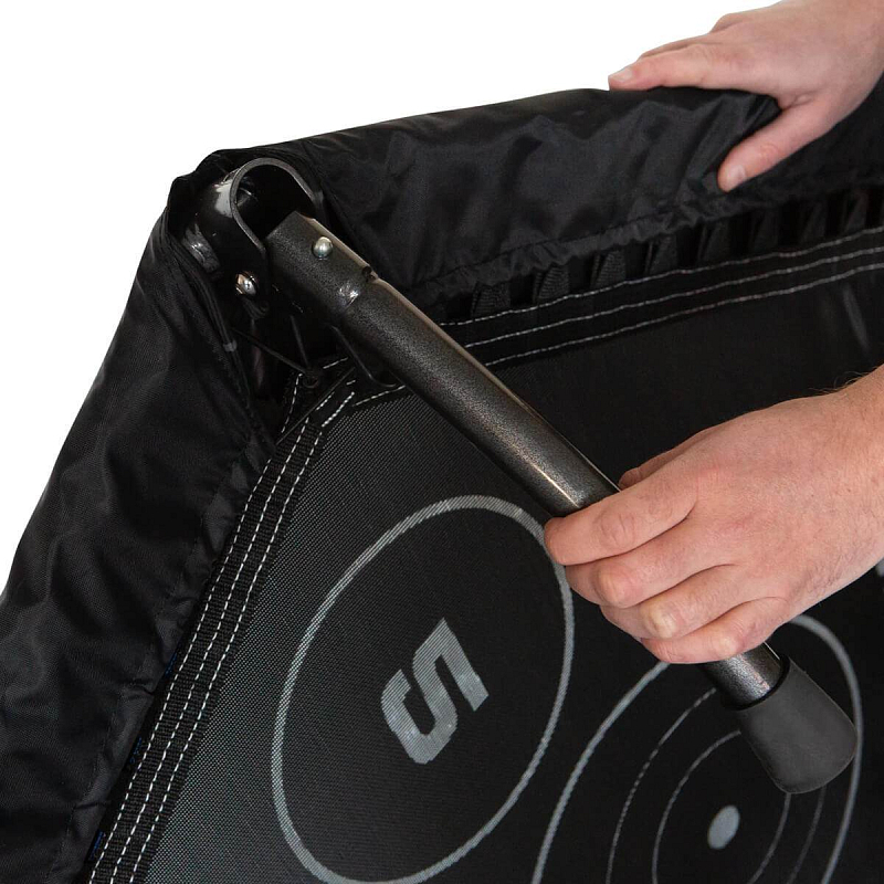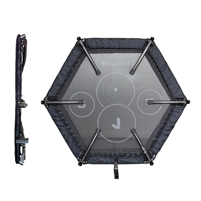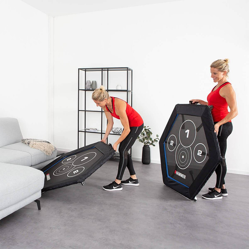 Bonusem HAMMER Fitness Cross Jump je skládací mechanismus. Nohy trampolíny lze snadno a rychle sklopit pomocí tlačítka. Rukojeť je odnímatelná. Po složení trampolína dosahuje výšky max 10 cm a snadno ji tak uklidíte pod postel, za skříň nebo opřete o zeď.