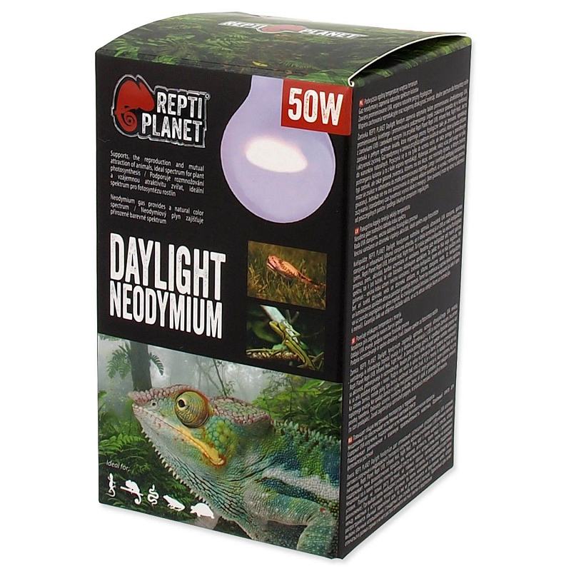 Žárovka REPTI PLANET Daylight Neodymium poskytuje optimální poměr ultrafialového UVA záření, světelného záření a infračerveného (tepelného) záření a je ideální v kombinaci s UVB a nočními žárovkami (např. Repti Planet Repti UVB, Infrared Heat, Night Heat). Jedná se o širokospektrální žárovku, která podporuje fyziologické procesy jako je např. aktivita, příjem potravy a rozmnožování. Neodymiový plyn v žárovce dokáže upravit světelné spektrum na hodnoty, které jsou velmi podobné přírodním podmínkám. Napomáhá to nejen růstu rostlin, ale především vnímání barev (podporuje rozmnožování).