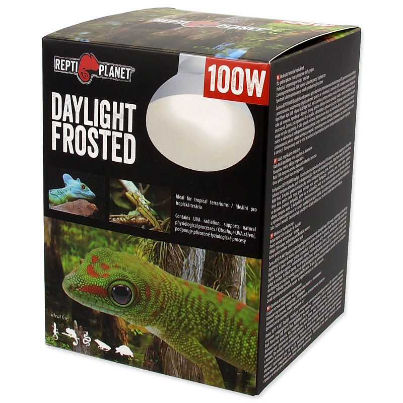 Žárovka REPTI PLANET Daylight Frosted poskytuje optimální poměr ultrafialového UVA záření, světelného záření a infračerveného (tepelného) záření a je ideální v kombinaci s UVB a nočními žárovkami (např. Repti Planet Repti UVB, Infrared Heat, Night Heat). Jedná se o širokospektrální žárovku, která podporuje fyziologické procesy jako je např. aktivita, příjem potravy a rozmnožování. Studené barevné spektrum imituje světlo v tropických oblastech a deštných pralesích. Žárovka je vhodná např. pro tropické žáby, gekony a ještěry.