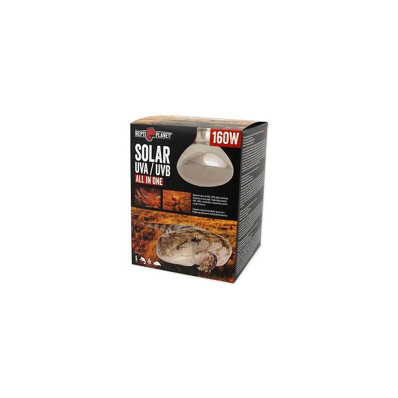 Žárovka REPTI PLANET Solar UVA UVB poskytuje optimální poměr ultrafialového světla (UVA, UVB záření), viditelného světla a infračerveného světla (tepla) v jedné žárovce. Jedná se o celospektrální žárovku, která podporuje fyziologické procesy jako je např. aktivita, příjem potravy a rozmnožování. Díky produkci vitamínu D3 napomáhá k optimální absorpci vápníku a zajišťuje tak správný vývoj a růst terarijních zvířat.